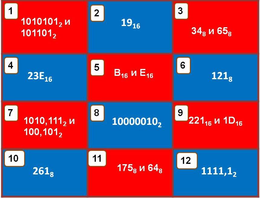 Упражнение 6В красных клетках таблицы записаны числа, которые надо сложить. В синих - их суммы. Найдите соответствия чисел и сумм. В окно ответа запишите номера клеток (подряд без пробелов) с суммами для чисел, размещённых в клетках: 1, 3, 5, 7,9, 11. |