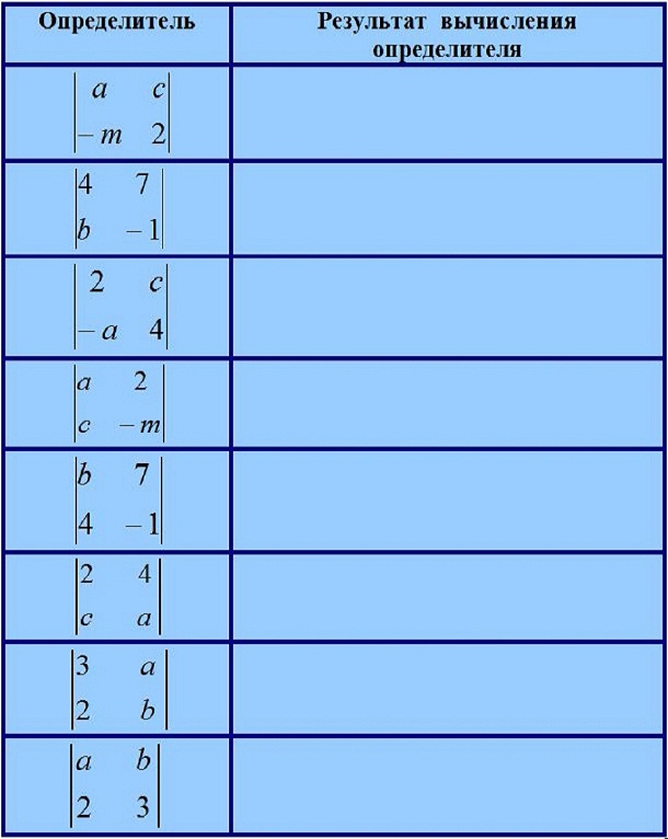 Разместите результат вычисления определителей в таблице. В окно ответа запишите номера результов вычисления подряд без пробелов и запятых.